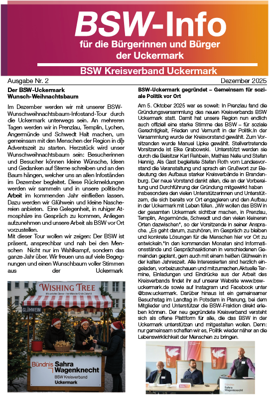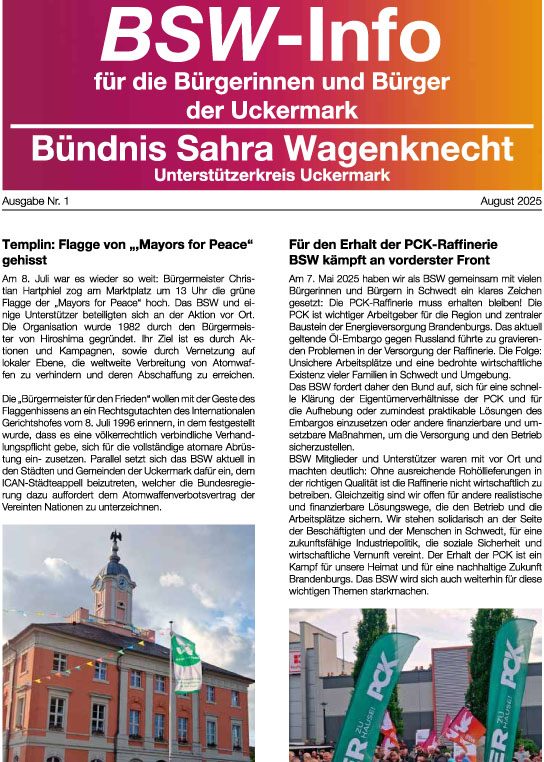 Hier findet ihr unsere regionale BSW Uckermark Zeitschrift, in der wir die aktuellen Entwicklungen und Themen der BSW Politik in unserer Region beleuchten. Die Zeitschrift bietet einen umfassenden Überblick über wichtige politische Entscheidungen, lokale Initiativen und die Arbeit unserer engagierten Mitglieder. Informiert euch über die Herausforderungen und Chancen, die die BSW Gemeinschaft in der Uckermark prägen, und bleibt auf dem Laufenden über Veranstaltungen, Diskussionen und Projekte, die unseren Zusammenhalt stärken. Gemeinsam gestalten wir die Zukunft unserer Region!