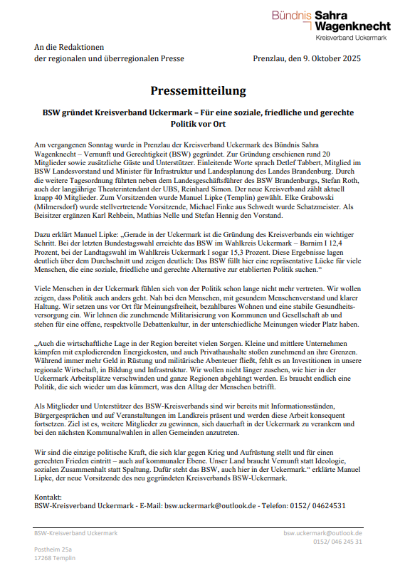 Am 05.10.2025 gründeten wir in Prenzlau den Kreisverband des BSW in der Uckermark. In einer feierlichen Sitzung wurde Manuel Lipke zum Vorstandsvorsitzenden gewählt. Zudem übernimmt Michael Finke als Schatzmeister. Diese Gründung ist ein wichtiger Schritt, um die politischen Interessen unserer Mitglieder in der Region effektiver zu vertreten und eine starke Stimme für soziale Gerechtigkeit und Arbeitnehmerrechte in der Uckermark zu sein.